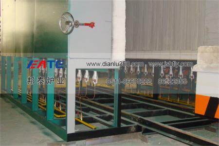 3、臺(tái)車(chē)骨架由各種大型工字鋼、槽鋼、角鋼及厚鋼板等組合焊接而成。臺(tái)車(chē)傳動(dòng)采用電動(dòng)機(jī)、蝸輪減速機(jī)組合通過(guò)鏈條帶動(dòng)前端主動(dòng)輪傳動(dòng)。臺(tái)車(chē)耐火砌體采用高鋁定型磚結(jié)構(gòu),與爐體密封效果好,耐壓強(qiáng)度高。臺(tái)車(chē)與爐體密封采用軟接觸的方法,并在臺(tái)車(chē)下部設(shè)有迷宮式沙封槽及沙封刀密封裝置。<br>3、爐門(mén)采用側(cè)開(kāi)式,簡(jiǎn)單方便,密封采用手輪壓緊機(jī)構(gòu)。