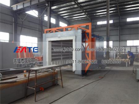 爐門裝置由爐門、爐門提升機(jī)構(gòu)和爐門壓緊裝置組成。爐門殼體由型鋼與板材焊接而成牢固框架結(jié)構(gòu),內(nèi)用耐火纖維壓制模塊疊鋪而成,保溫性能好,重量輕。爐門的提升裝置采用電動(dòng)裝置,主要由爐門架、爐門提升橫梁、電動(dòng)葫蘆等部分組成,本爐爐門結(jié)構(gòu)相對(duì)較大,穩(wěn)妥,本爐爐門升降采用電動(dòng)葫蘆來(lái)完成,通過(guò)電動(dòng)葫蘆的正反傳動(dòng)來(lái)帶動(dòng)爐門的升降。爐門壓緊裝置采用國(guó)內(nèi)先進(jìn)的彈簧式壓緊結(jié)構(gòu),當(dāng)爐門需要提升時(shí),爐門的自重通過(guò)杠桿將爐門自動(dòng)松開(kāi),并水平移出一段距離后上升,當(dāng)爐門下降到位,爐門放下到臺(tái)車上的滑輪上面需壓緊時(shí),由彈簧的彈力再通過(guò)杠桿將爐門水平移進(jìn)到壓緊密封狀態(tài),此種結(jié)構(gòu)的壓緊裝置使?fàn)t門上的纖維平面與爐口棉之間無(wú)摩擦產(chǎn)生,具有使用壽命長(zhǎng)的特點(diǎn)。
