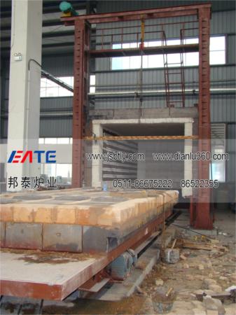 5、臺車耐火砌體采用高鋁定型磚結構,與爐體密封效果好,耐壓強度高。臺車面擱置墊鐵供堆放工件用。臺車幫板全部采用澆筑件,保證車體不變形及耐用性。爐車與爐襯的密封采用耐火纖維密封塊電動推桿自動壓緊結構。側密封的開、閉與爐車進出連鎖。