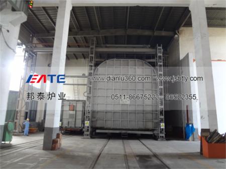 2.燃?xì)馀_(tái)車爐主要由爐體、爐襯、爐門、自行走臺(tái)車系統(tǒng)、高速燃燒系統(tǒng)、管路及其壓力自控系統(tǒng)、爐壓自控及排煙余熱回收系統(tǒng)、密封裝置、溫度控制及記錄系統(tǒng)、計(jì)算機(jī)系統(tǒng)等主要部分組成。設(shè)備以各式燃燒氣體為介質(zhì),通過的高速燒嘴燃燒加熱,溫度1250℃。