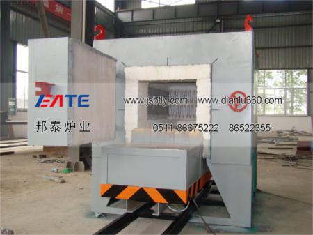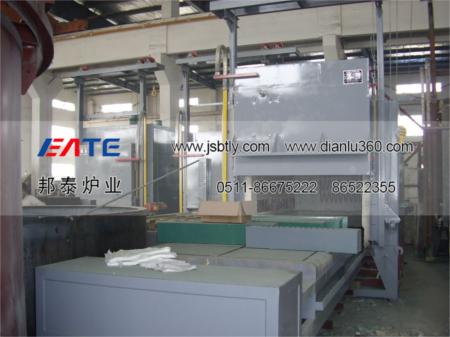 臺車框架采用型鋼焊接成形,其鋼性保證在滿負(fù)荷下不變形。內(nèi)用耐火磚砌筑,易碰撞部位和承重部位用重質(zhì)磚砌筑,增強爐襯結(jié)構(gòu)強度,臺車的行走采用自行式結(jié)構(gòu),由減速機傳動鏈輪帶動走輪在軌道上行走。臺車密封采用自動迷宮式結(jié)構(gòu)和軟接觸雙密封,臺車進(jìn)入爐內(nèi)通過凸輪及滾輪斜面作用,自動升起后進(jìn)行密封。臺車開出,該密封槽自動落下,密封槽內(nèi)密封砂經(jīng)加滿后即不必經(jīng)常添加。臺車開出,爐門升降均為電動控制,配有電磁制動器,可防止慣性撞擊爐體,并且連鎖控制,即稍打開爐門后,自動切斷加熱元件,同時恢復(fù)臺車行走機構(gòu)電源。爐門關(guān)閉到位后,自動切斷臺車行走機構(gòu)電源,同時恢復(fù)加熱元件電源。